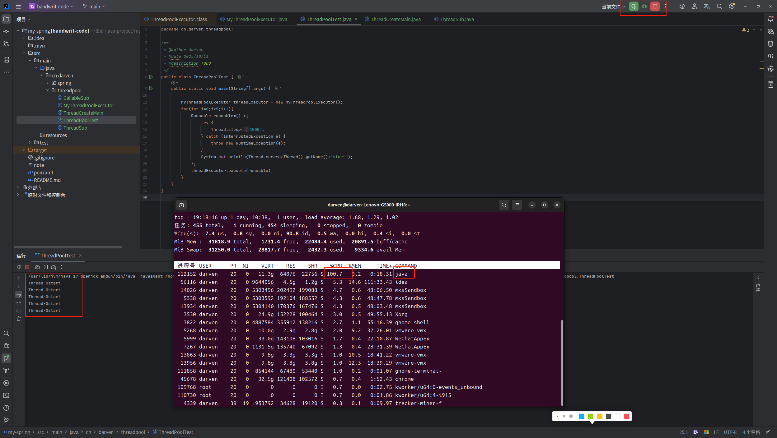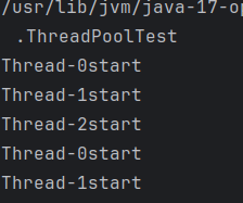 1 2 3 4 5 6 7 8 9 10 11 12 13 14 15 16 17 18 19 20 21 22 23 24 25 26 27 package cn.darven.threadpool;import java.util.concurrent.LinkedBlockingDeque;public class ThreadPoolTest { public static void main (String[] args) { MyThreadPoolExecutor threadExecutor = new MyThreadPoolExecutor (3 ,new LinkedBlockingDeque <>(8 )); for (int i=0 ;i<5 ;i++){ Runnable runnable=()->{ try { Thread.sleep(1000 ); } catch (InterruptedException e) { throw new RuntimeException (e); } System.out.println(Thread.currentThread().getName()+"start" ); }; threadExecutor.execute(runnable); } } }
