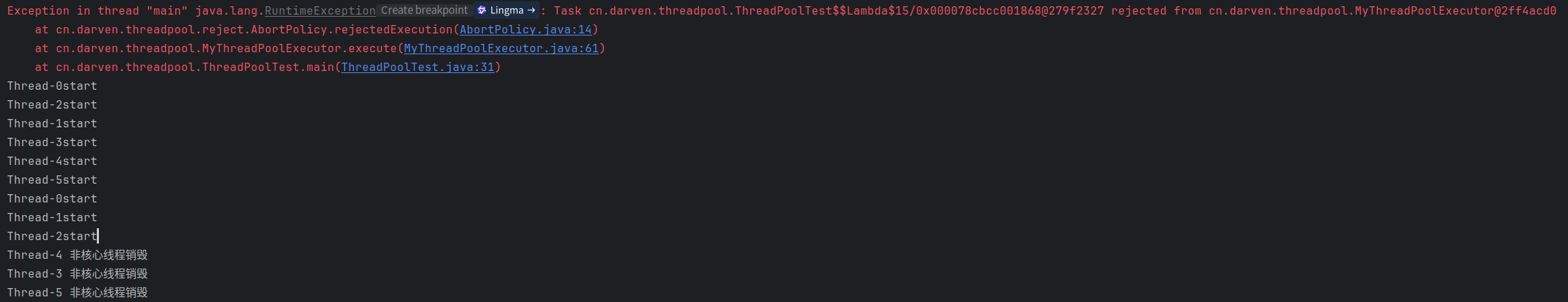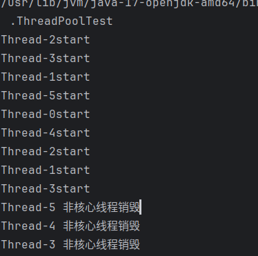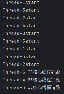 1 2 3 4 5 6 7 8 9 10 11 12 13 14 15 16 17 18 19 20 21 public class ThreadPoolTest { public static void main (String[] args) { MyThreadPoolExecutor threadExecutor = new MyThreadPoolExecutor (3 , 6 , 5 , TimeUnit.SECONDS ,new LinkedBlockingDeque <>(3 )); for (int i=0 ;i<9 ;i++){ Runnable runnable=()->{ try { Thread.sleep(1000 ); } catch (InterruptedException e) { throw new RuntimeException (e); } System.out.println(Thread.currentThread().getName()+"start" ); }; threadExecutor.execute(runnable); } } }